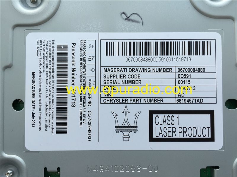 Radio Unit Panasonic CQ-ZC92E0GXD SINGLE CD DVD Player for MASERATI Ghibli Levante Chrysler 68194571AD Fiat Freemont Radio Audio Media Video SD DRAWING NUMBER 06700084880
